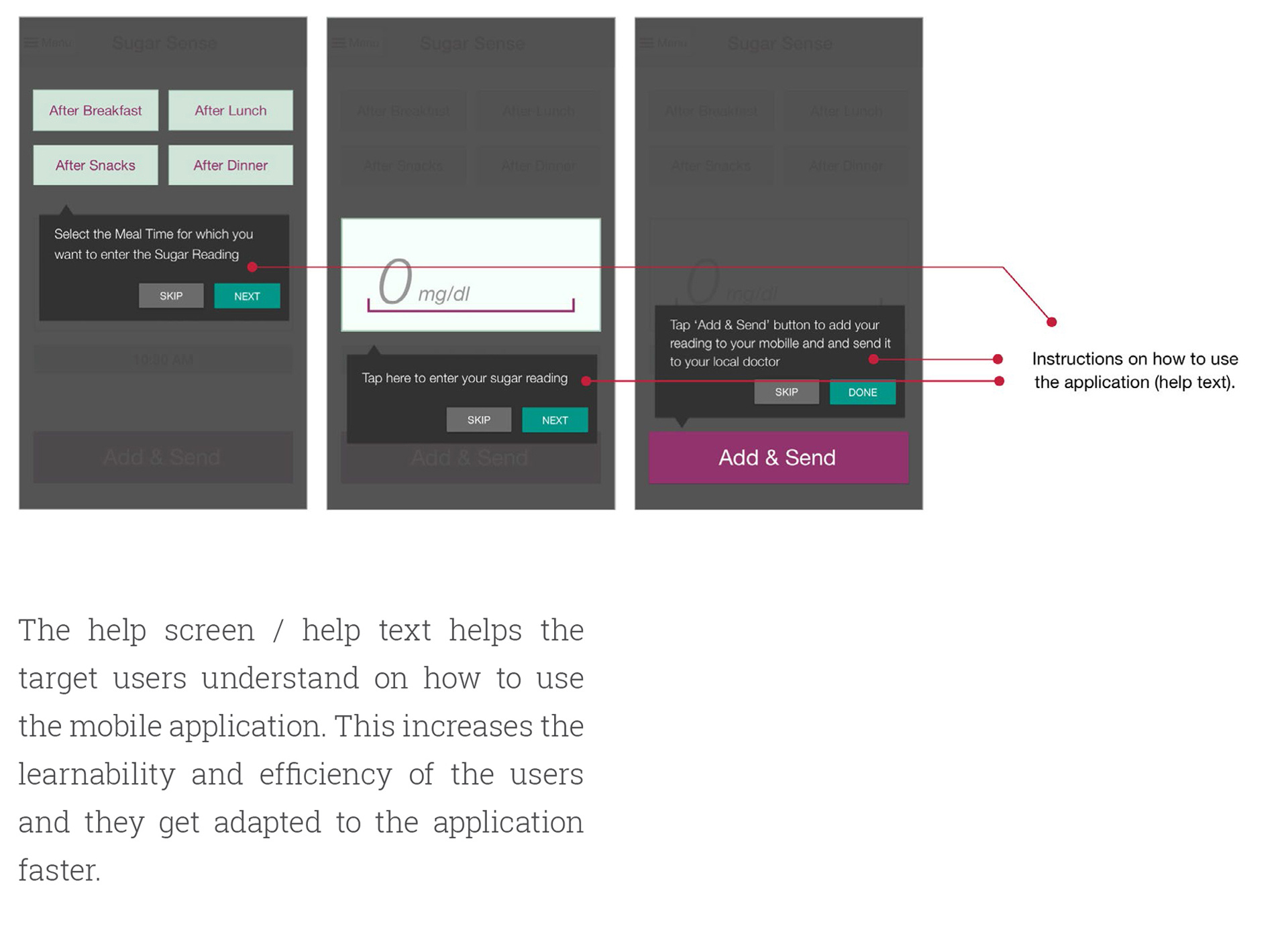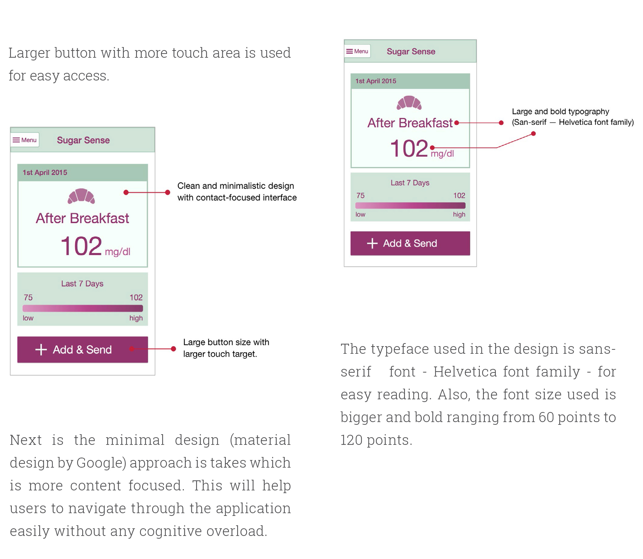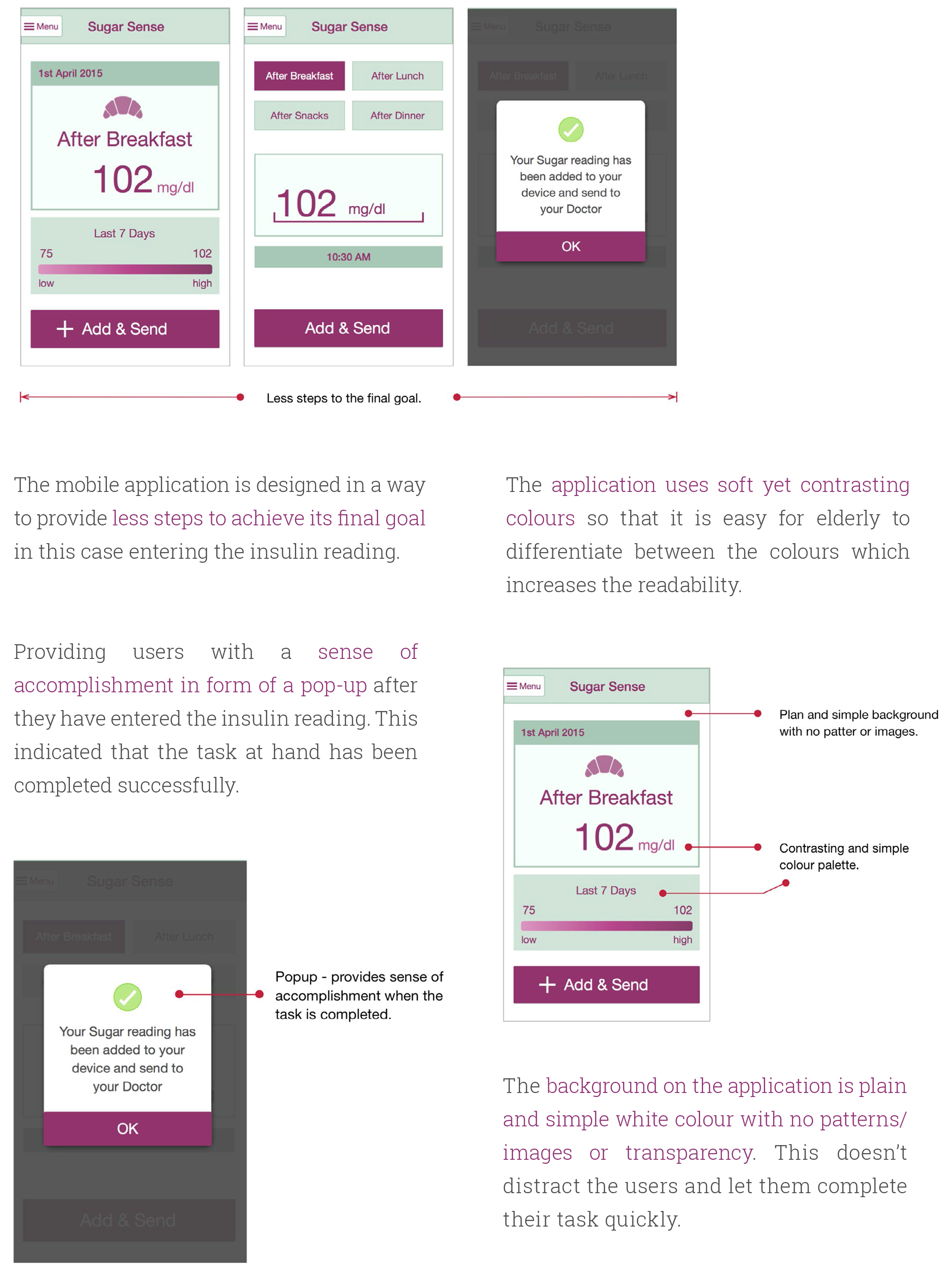 • Drawback: most of the diabetic patients are 50+, the application is not designed keeping in mind the old people. Therefore, they might feel is difficult to use and may face usability issues when using the application.